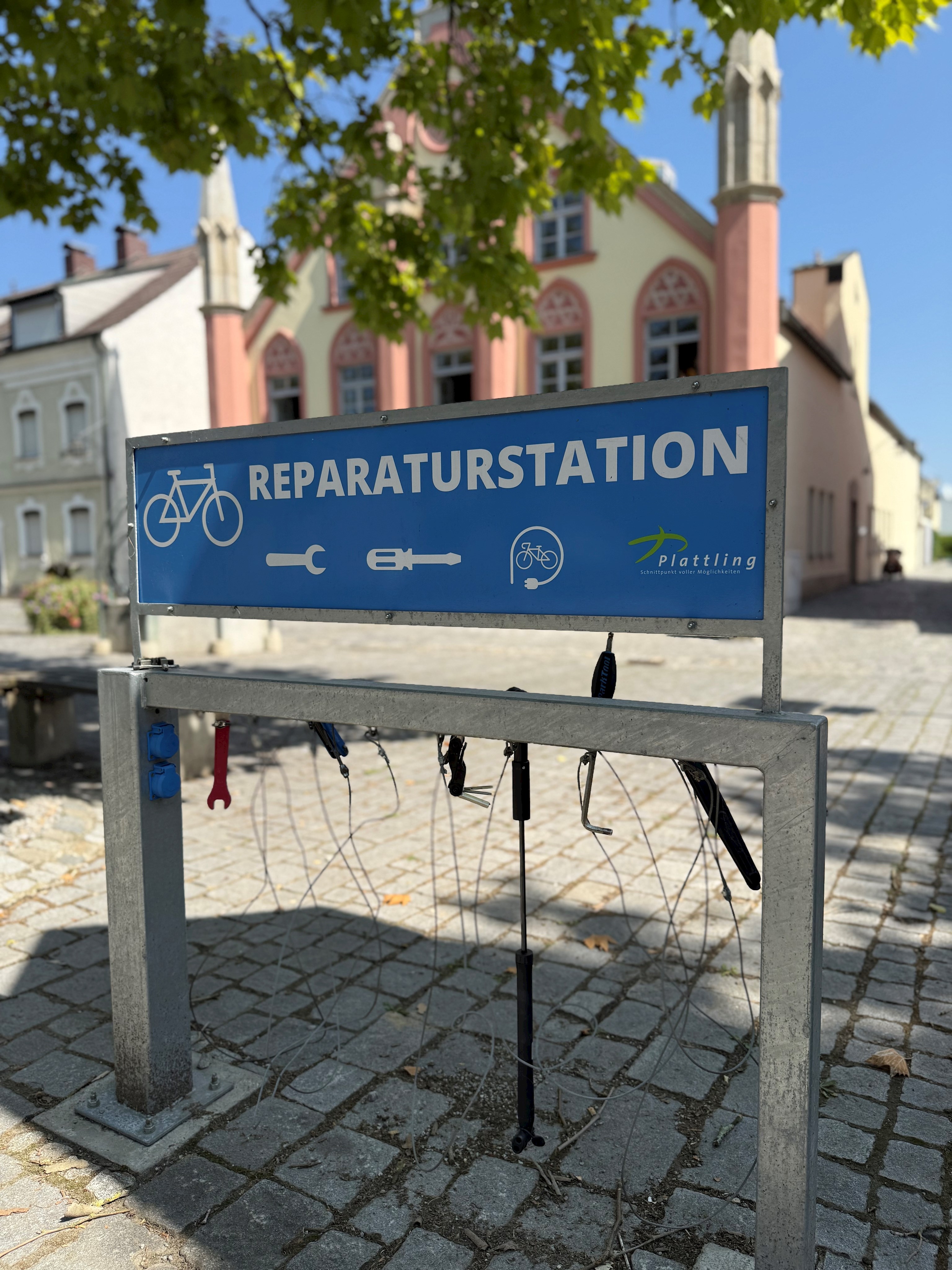 Die Stadt Plattling ließ im Jahr 2022 in zentraler Lage direkt vor dem Bürgerspital (Ludwigplatz 8) eine Fahrradreparaturstation aufbauen.