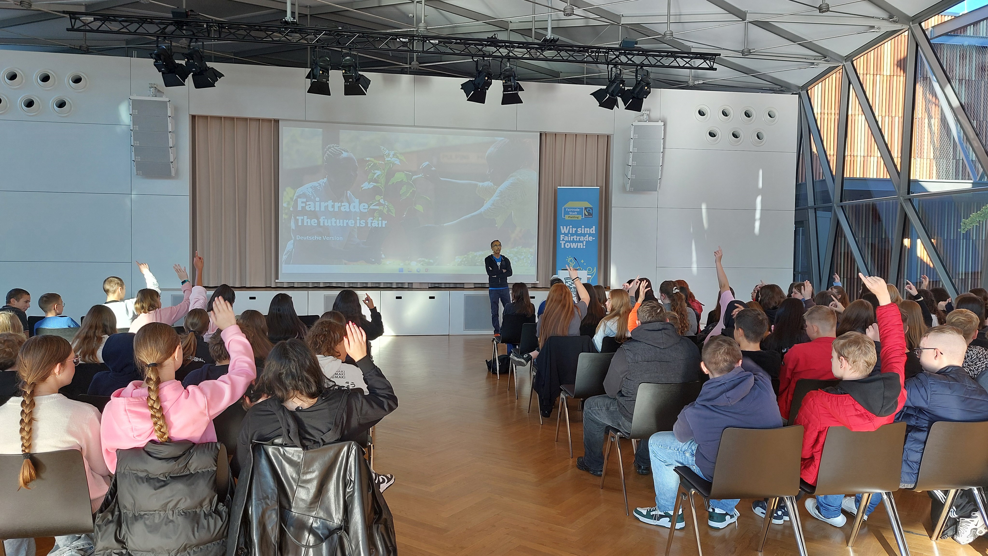 Heidi Koschollek stelle den Bildungsreferenten George Levy Meister von Fairtrade vor. Sie formulierte das Anliegen der Steuerungsgruppe, Fairtrade als bedeutende Aufgabe für die Zukunft unserer Kinder und Jugendlichen wahrzunehmen. 120 Schülerinnen und Schüler der 7. Und 8. Klassen der Mittelschule waren mit ihren Lehrkräften in den Bürgersaal gekommen. „Fairtrade – the future is fair“ stand gleich groß zu Beginn auf der großen Leinwand. „Das Gegenteil von fair ist unfair, von gerecht ungerecht!“, so begann Meister seinen Vortrag. Er bezog die Schülerinnen und Schüler stets in seinen Vortrag mit ein, stellte Fragen und übertrug vieles in die Lebenswelt der Kinder und Jugendlichen. Dabei gab es wirklich Interessantes zu erfahren. Der Kakao kommt zu 70 % aus Ghana und der Elfenbeinküste. Ganz wichtig war dem Referenten immer wieder darauf hinzuweisen, wofür Fairtrade steht. Nämlich für Sicherheit durch